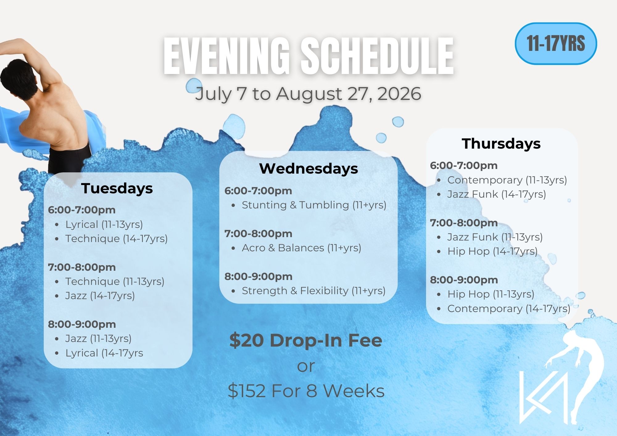 Our Summer Classes for Ages 11-17 runs Tuesday, Wednesday and Thursday evenings in July & August from 6:00 PM to 9:00 PM.