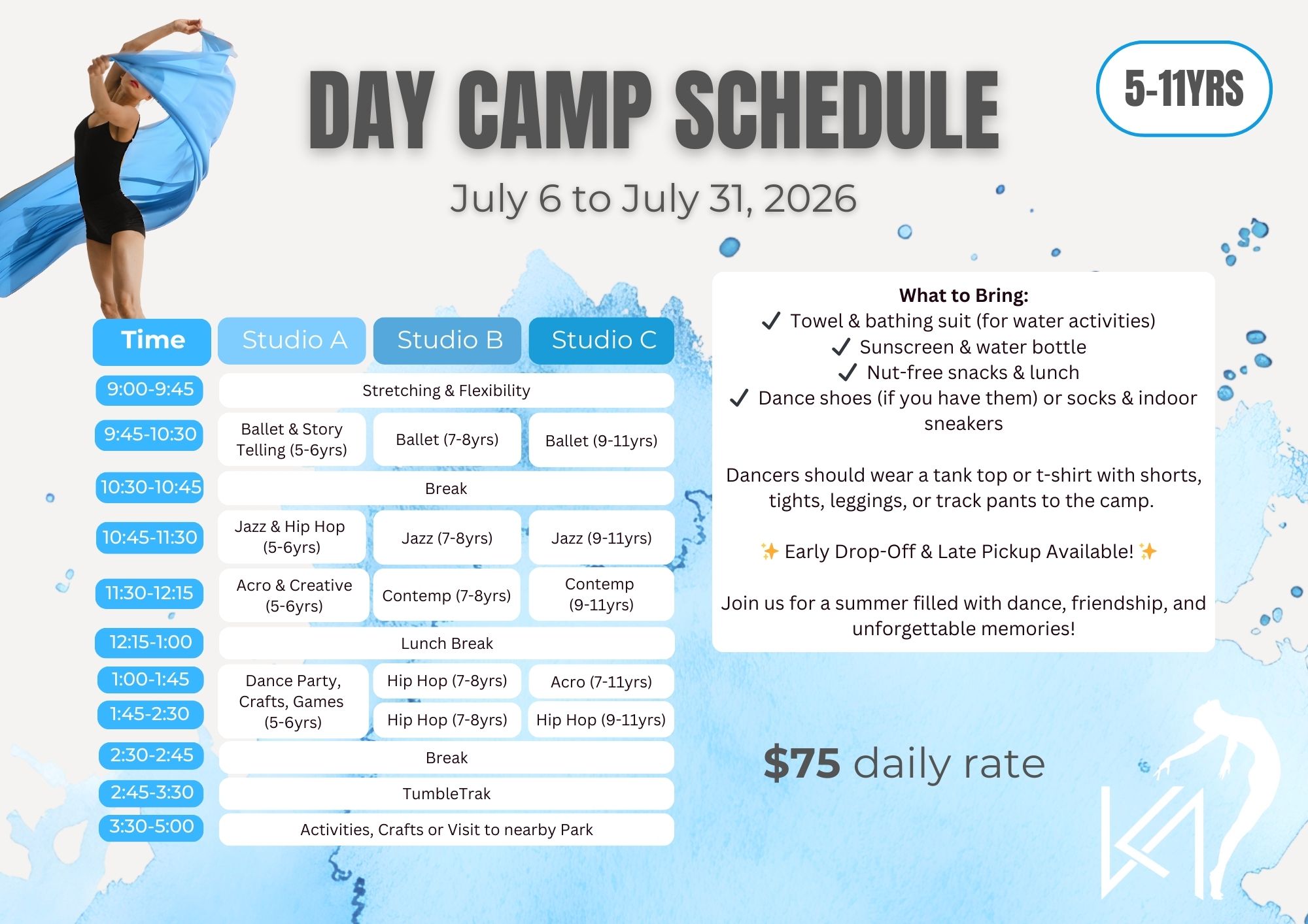 Students will attend a variety of dance classes each day, including Stretch & Flex, Ballet, Jazz, Contemporary, Acro, Tumbling, and Hip Hop! We provide adequate breaks throughout the day with time for arts & crafts and visits to the nearby park.